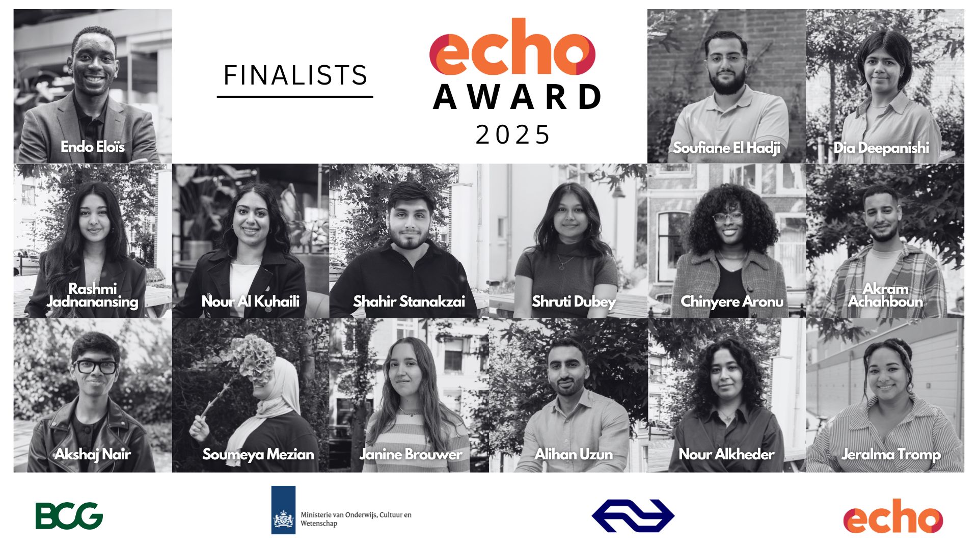 The ECHO Award is an annual recognition for students with a non-Western or refugee background who are studying in higher education and creating impact on urgent social issues. During the ceremony, we honour the finalists and winners who distinguish themselves through their dedication, vision, and contributions to a more inclusive society.