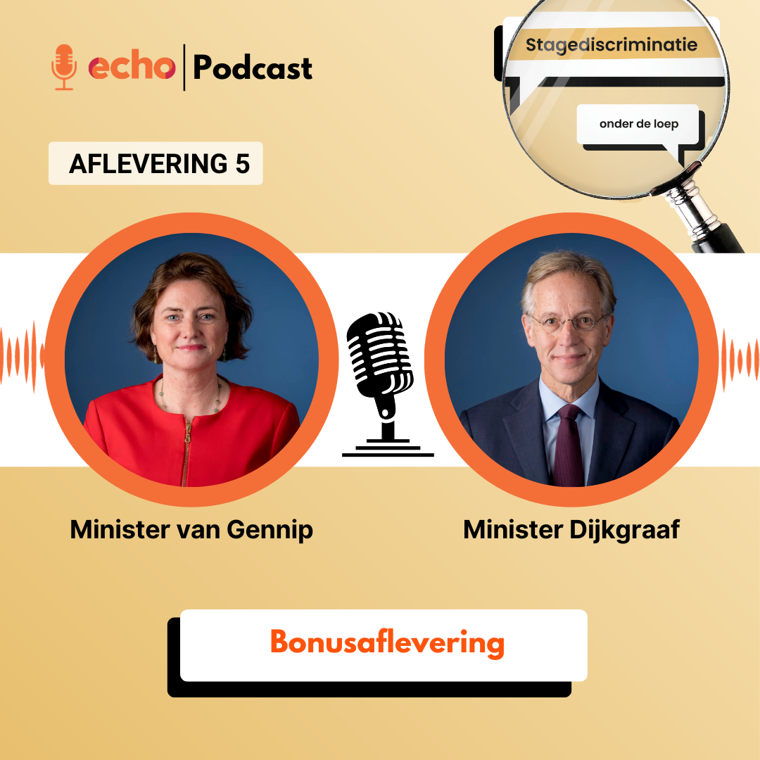 In deze bonusaflevering verwelkomen we twee speciale gasten die een cruciale rol hebben gespeeld in het erkennen van stagediscriminatie als maatschappelijk probleem vanuit de politiek en hier ook concreet vervolg aan hebben gegeven. Samen met minister Van Gennip van Sociale Zaken en Werkgelegenheid en minister Dijkgraaf van Onderwijs, Cultuur en Wetenschap gaat Pravini Baboeram (host) in gesprek over keymomenten en inzichten die voor beide ministers hun visie op stagediscriminatie gevormd hebben. Ook bespreken zij waar volgens hen de kansen en mogelijkheden liggen om tot daadwerkelijk concrete verandering te komen als het gaat om stagediscriminatie. Als laatste kijken ze in deze aflevering vooruit naar de toekomst en reflecteren zij op wat ze mee willen geven aan hun opvolgers.
